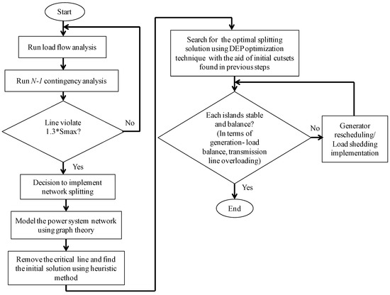 A new meta-heuristic approach in determining an optimal network splitting strategy following critical line outages based on N-1 contingency analysis is presented in this paper. The N-1 contingency analysis will provide a list of critical lines where, in the event of any failure on the line, serious cascading failures might occur. In this study, a DEP optimization technique is used to find the optimal splitting solution (cutsets) with the aid of initial cutsets obtained through a heuristic approach. A simple and practical load shedding scheme is introduced to ensure reliable island operation when any imbalance between generation and load is detected. The proposed strategy is illustrated in Figure 1. In general, the strategy is divided into four main steps: N-1 contingency analysis; network modeling based on graph theory approach; initial cutsets using a heuristic approach; DEP optimization for an optimal network splitting solution. Descriptions and formulations for each step are further presented in the next section.