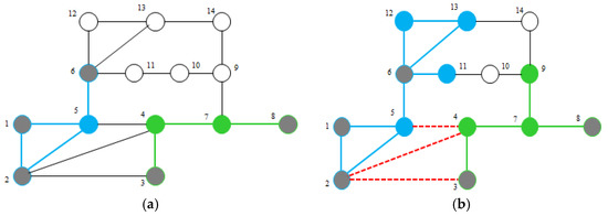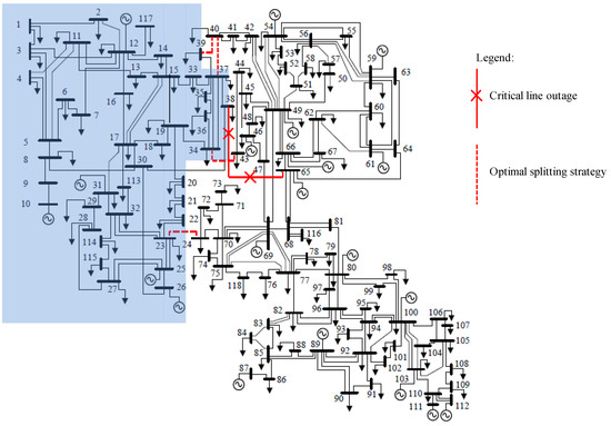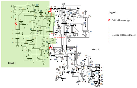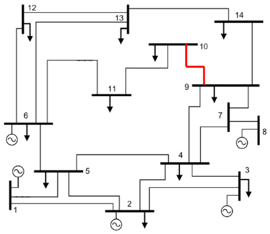For example, the red line (Line 9–10) in the IEEE 14-bus system as shown in Figure 2 is one of the critical lines (exceed 130% of its maximum limit) obtained from the contingency analysis. Contingency analysis shows that, if this line is disconnected from the system due to any outages occurring on the line, multiple cascading failures will occur. Therefore, proper network splitting is needed to prevent cascading failures once this line is disconnected from the system.