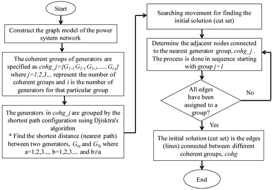 In this work, suitable initial cutsets that are close to the final optimal splitting solution are computed using the proposed heuristic approach. The proposed heuristic method considers the number of islands and coherent groups of generators during initial cutsets determination. Through the proposed method, the search space of possible lines to be disconnected can be reduced and the convergence process can be accelerated. The first step in implementing the proposed approach is creating the backbone of the network by grouping the coherent generators into particular groups using the shortest path approach. Next, the nearest vertices (line) is assigned to the nearest coherent groups of generators. The line that lies in between the different group of generators is the cutset candidate. The reason for making such a grouping is to ensure the easy coordination of coherent generators in controlling power generation for the loads in the island. Furthermore, this approach will group the coherent generators in the same island, which helps in maintaining the stability of each island after network splitting implementation. The shortest path between the vertices is found based on Djisktra’s algorithm [22]. The detailed implementation of the approach is presented in Figure 4.