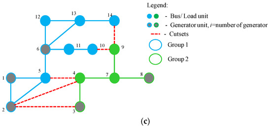 For a better understanding, the IEEE 14-bus test system is used to illustrate the process of initial cutsets determination using a heuristic approach. In this example, the coherent groups of generators are assigned as cohg_1 = {1, 2, 6} and cohg_2 = {3, 8}. An example of backbone formation of the two groups of coherent generators is shown in Figure 5a, the edges between different coherent groups, cohg, is the cutset as shown by the dashed line in Figure 5b, and the cutsets, CS = {CS2–3, CS2–4, CS4–5, CS9–10, CS9–14}, obtained is illustrated in Figure 5c. The dashed line is the initial cutset for the discrete optimization technique.