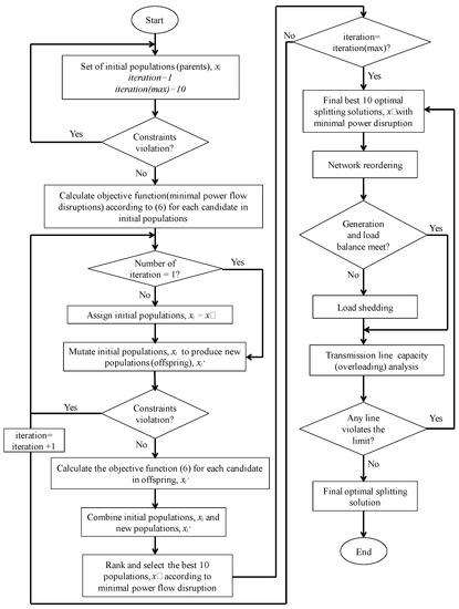 Pi is the active power flow on the transmission line (i) in the cutsets that form the islands, and nline defines the total number of cutsets (transmission lines to be disconnected). The objective function Equation (6) is calculated for each initial population.