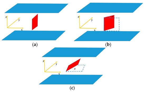 Illustration of three fracture geometries: (a) Rectangle fracture plane which is parallel to the y-z plane and x-z plane; (b) Rectangle fracture plane with strike angle ; (c) Rectangle fracture plane with dip angle .