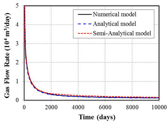 The simulation was run for 10,000 days, for the newly developed 3D semianalytical model, an analytical model (Kappa Topaz) and a commercial reservoir simulator (CMG). The comparison results of the gas flow rates are plotted in Figure 3. The three curves in Figure 3 are so close to each other, with relative error less than 3%, illustrating that the newly developed 3D semianalytical model can accurately calculate the shale gas production for reservoirs with fully penetrated fractures. For the detailed description of the comparison, readers could refer to the authors’ another work [29].