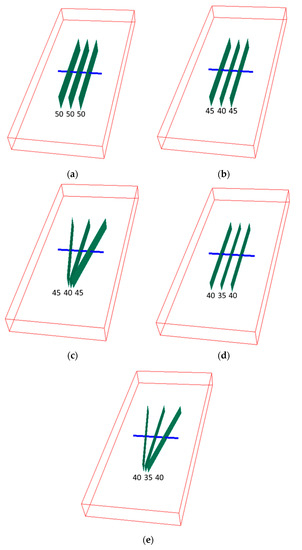The differences between Case 1, Case 2/3 and Case 4/5 are the fracture heights. Case 1 (Figure 4a) has three hydraulic fractures with 50 m height, which are fully penetrated in the reservoir. Cases 2 and 3 (Figure 4b, c) have three fractures with variant heights, 45 m, 40 m and 45 m from left to right. Case 4 and Case 5 (Figure 4d and Figure 2e) have three fracture with heights 40 m, 35 m and 40 m. The differences between Case 2 and Case 3 are the strike angles. Case 2 has three fractures with 0° strike angles, but Case 3 has tree fractures with strike angles −10°, 0°and 10°. The same strike angle difference exists for Case 4 (Figure 4d) and Case 5 (Figure 4e).