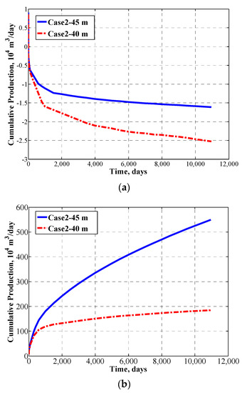Figure 6 shows clearly that the impacts of fracture areas for the shale gas productions. With decreasing fracture heights from Case 1 to Case 2 and Case 4, while their lengths are the same, the fracture areas are correspondingly decreasing. It is seen from Figure 6 that the cumulative productions of Case 1, Case 2 and Case 4 are decreasing too, with the similar ratio as the fracture heights. For example, the total fracture heights of Case 1 and Case 2 are 150 m and 130 m, respectively, and the ratio of the total heights are 87%, which is very close to the cumulative production ratio of Case 1 and Case 2. The same comparison result holds true for Case 4.