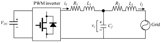 Figure 1 shows a three-phase grid-connected inverter with an LCL filter, in which denotes the DC-link voltage, R1, R2, L1, and L2 are the filter resistances and filter inductances, respectively, and Cf is the filter capacitance. From Figure 1, the inverter system can be mathematically expressed in the synchronous reference frame as