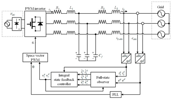 Figure 2 shows the block diagram of the proposed control scheme for a three-phase inverter connected to the grid through LCL filters, where the symbol “^” denotes the estimated quantities. The proposed control scheme basically consists of an integral state feedback controller, and a full-state observer with the measurement of only the grid-side currents and grid voltages. The measured grid voltages are also employed in the phase lock loop (PLL), to generate the phase angle of the grid voltage. The full-state observer is constructed by using an LCL-filtered inverter model to estimate the system states from the control input and the system output y. Then, the estimated states are used for the integral state feedback controller to track the reference currents.