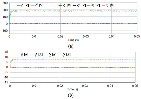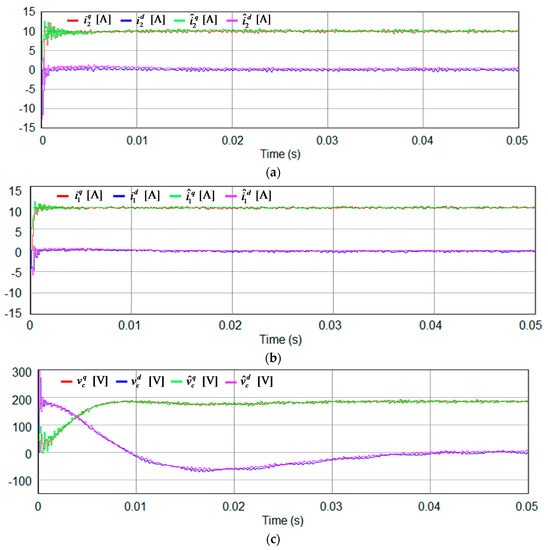 Simulation results for the inverter states and estimated states using the proposed discrete-time integral state feedback control scheme with state observer. (a) Waveforms of grid-side currents and estimated states at the synchronous reference frame (SRF); (b) Waveforms of inverter-side currents and estimated states at the SRF; (c) Waveforms of capacitor voltages and estimated states at the SRF.