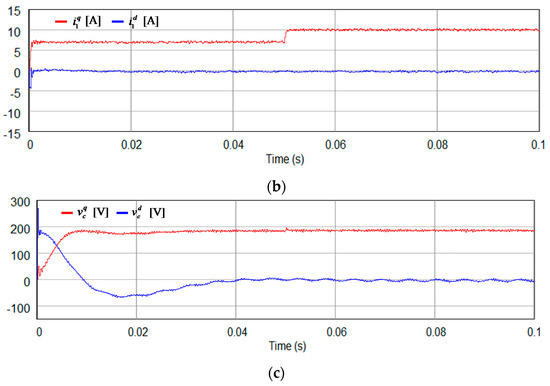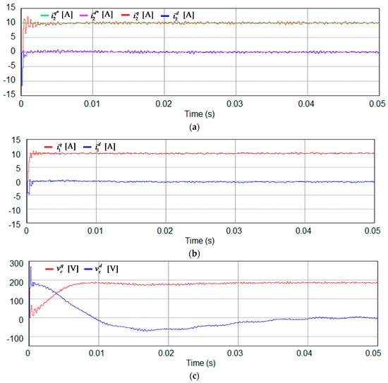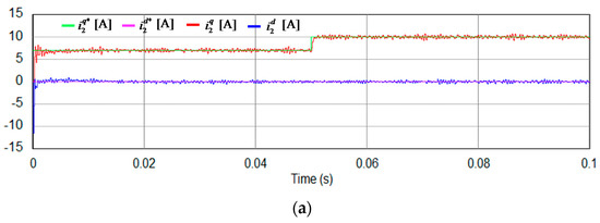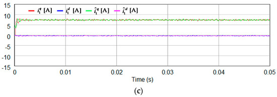 Figure 7 shows the simulation results for the proposed integral state feedback control scheme with state observer under the step change in q-axis current reference. In this simulation, the q-axis reference current undergoes a step change from 7 to 10 A at 0.05 s. It is clearly shown in Figure 7a that the grid-side currents reach the reference current values with a considerably small time delay. Since the PLL already reached the steady state during start-up period, the grid-side q-axis current can effectively track the step change in reference value within 0.5 ms, without showing such a large oscillation in this case. This indicates the sufficiently fast transient response of the proposed control scheme. Additionally, the fast transient response of the proposed control scheme can be inferred from Figure 7b,c.