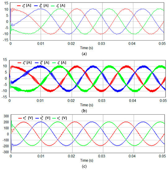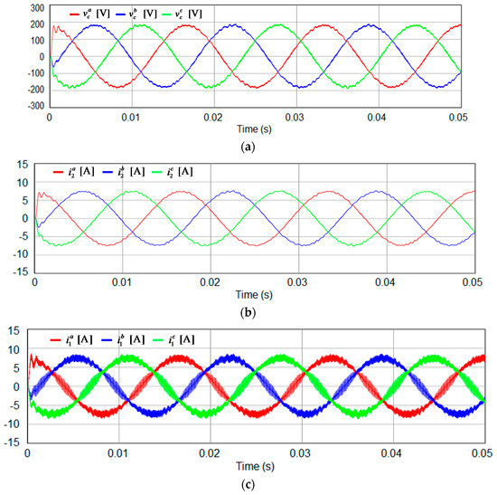 Figure 6 represents the simulation results for three-phase variables using the proposed integral state feedback control scheme with state observer. As can be seen from Figure 6a, three-phase grid-side current waveforms are relatively sinusoidal. In fact, the grid-side phase currents have the THD level of 2.57% in this case. Also, Figure 6b,c show actual three-phase inverter-side current waveforms and three-phase capacitor voltage waveforms.