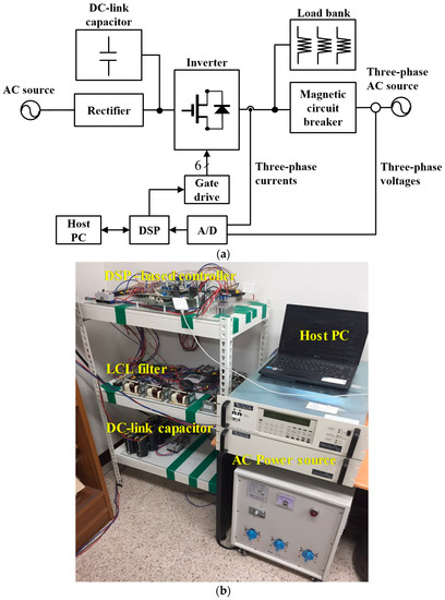 For the experimental validation of the proposed control scheme, the experimental setup has been constructed, which consists of a DSP-based controller, a three-phase inverter connected to the grid through an LCL filter, a magnetic contactor for grid connecting operation, and an AC power source to imitate three-phase grid voltages. The control algorithm is performed by a 32-bit floating-point DSP TMS320F28335 [23], to control a 2 kW laboratory prototype inverter. The configuration of the entire experimental system is illustrated in Figure 10a. An intelligent power module is employed for three-phase grid-connected inverter, and the switching frequency (sampling frequency) is chosen as 10 kHz. Figure 10b shows the photograph of the experimental test setup.