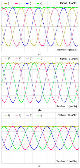 Figure 11 shows the experimental results for the inverter system using the proposed discrete-time integral state feedback control scheme with state observer. It can be observed from q-axis and three-phase grid-side currents in Figure 11a that the proposed control scheme provides stable and reliable operation for the inverter system with considerably sinusoidal responses of grid-side phase currents. Stable operation of the state observer can be also observed from Figure 11b,c, in which inverter-side three-phase currents, , , and , are calculated from the estimated currents and , and three-phase capacitor voltages, , , and , from the estimated capacitor voltages and , respectively.