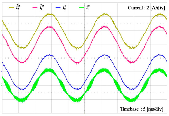 Experimental results for the measured and estimated waveforms of a-phase grid-side current and inverter-side current.