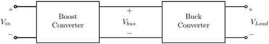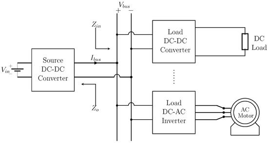 Cascaded DC-DC systems have been widely used in aerospace, maritime, and automobile industries due to their attractive features such as modularity, scalability, high power density, and high reliability [1]. They provide a flexible environment to efficiently integrate renewable energy resources with the existing power systems [2,3]. Typically, a cascaded system consists of a line regulating converter (LRC) [4], which acts as the source, connected in series with a load subsystem, as shown in Figure 1. The load system might consist of DC-DC converters, inverters, or a combination connected in parallel [5]. Since most load converter modules are tightly regulated and supply a load with one-to-one characteristic of voltage-to-current or speed-to-torque relationships [6,7], these modules act as constant power loads (CPL). CPLs exhibit a negative incremental impedance seen by the LRC [8]. This characteristic is notorious for degrading the dynamic performance of cascaded systems and might lead to instability [9].