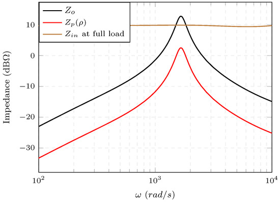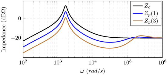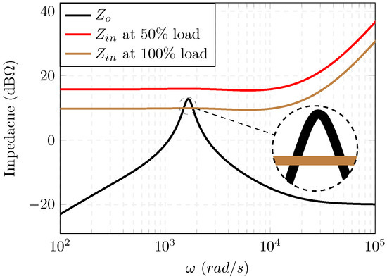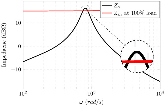 To validate the proposed controller, its corresponding LRC output impedance () is compared to the LRC impedance induced by using the original controller, , in Figure 9 at full load condition. was selected to be rad/s. had a peak impedance of dB (), while had dB (). The difference between them is dB which corresponds to (), where A.