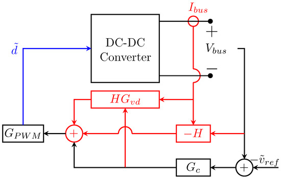 In references [30,31], a controller that preserves () relationship, and reshapes the output impedance of single phase inverters or multi-input-dual-active-bridge DC-DC converters was introduced, as shown in Figure 3. We propose modifications to this controller such that the output impedance is adaptively shaped according to Equation (6). The small-signal output voltage () of a DC-DC converter equipped with the controller of Figure 3 is expressed as