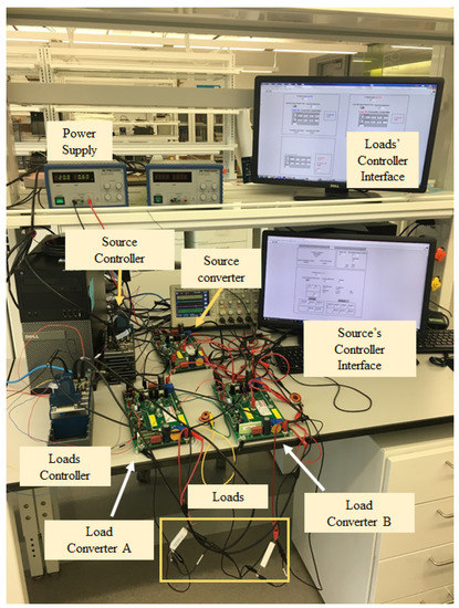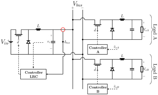 A test system consisting of a buck converter, as the (LRC), and two loads has been designed to validate the performance of the proposed controller. Figure 6 shows the system schematic diagram, and Table 1 tabulates its parameters. The loads’ controllers are described by Equation (A1) in the Appendix A.