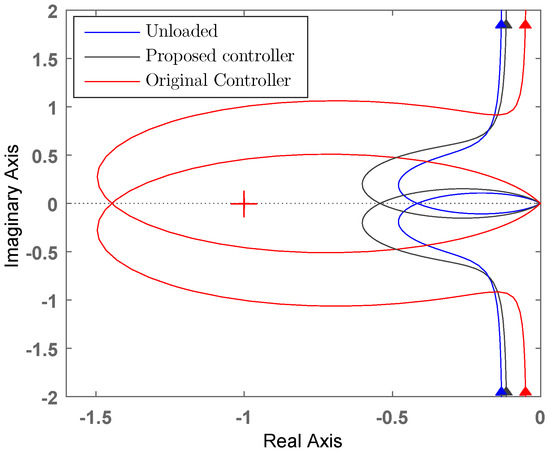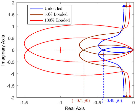 Nyquist diagram of the LRC loop gain () for the original controller for three loading conditions, where it encircles at 100% loading.