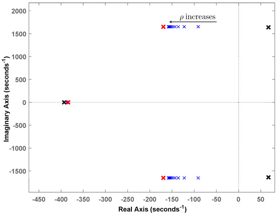Pole loci of the closed loop LRC, for unstable system with the original control at full load (black poles), original control at no load (red poles), and proposed control (blue poles), highlighting the decoupling capability, as a function of .