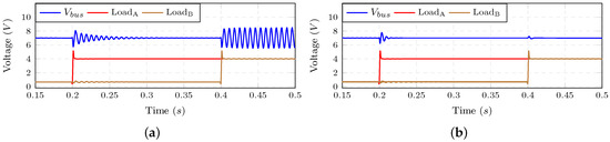 Figure 16a shows the response of the system with the original controller to show its inability to handle the entire load, where and denote the output voltages of loads A and B, respectively. Connecting LoadA caused a decaying oscillatory response for 100 ms. Then, integrating loadB totally destabilized the bus voltage. As discussed earlier, the output voltages of the loads were stable.