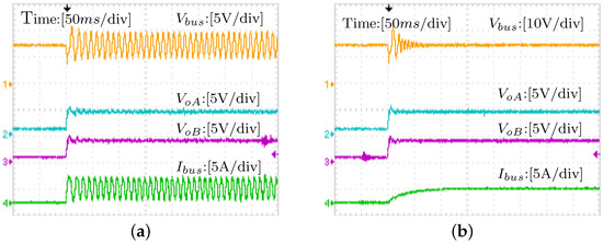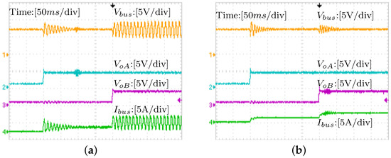 Experimental results of simultaneous switching of LoadA and LoadB: (a) without the proposed controller; and (b) with the proposed controller.