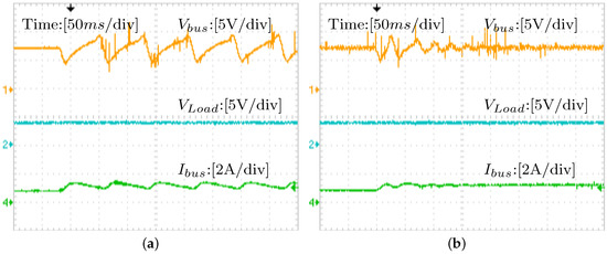 To further demonstrate the effectiveness of the proposed controller, both loads were connected simultaneously to the DC bus. The original controller was unable to handle both loads, as shown in Figure 13a. Figure 13b demonstrates the capability of our controller, which stabilized the system in 25 ms.
