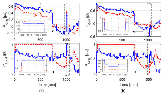 Result obtained from the simulations with both the proposed Energy Management System (solid blue line) and the EMS with perfect predictions of Equation (1) (dashed red line). (a) Power imported from the grid (top) and locally generated (bottom) under a sudden disconnection of the wind turbine at 1000 min; (b) Power imported from the grid (top) and locally generated (bottom) under a load impact at 1000 min.