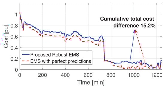However, enhancing the robustness of the grid implies an increase in the operating costs, due to a rising in the time of use of the local co-generation unit and the amount of power imported from the grid. From Figure 1, such an increase is more evident during the first 800 min of simulation. In this time-span, the amount of power imported from the distribution grid is slightly higher with the proposed EMS than with the EMS with perfect predictions. The difference in power taken from the grid is traduced in an increment in the cumulative operating costs of , which is traduced in better dynamic response and use of infrastructure, and in reduction of maximum power fluctuations in the point of common coupling arising from disturbances in the industrial grid. Moreover, the performance of a rolling-horizon-based EMS depends upon the quality of the predictions and hence on the accuracy of the model. Thus, Figure 4 shows a function of the accuracy of the models used to represent the uncertain variables. Indeed, if the model is not accurate enough, the difference between the operating costs with the proposed EMS and the EMS based on the minimization problem of Equation (1) could tend towards zero without the additional benefits provided by the robustness of our proposal.