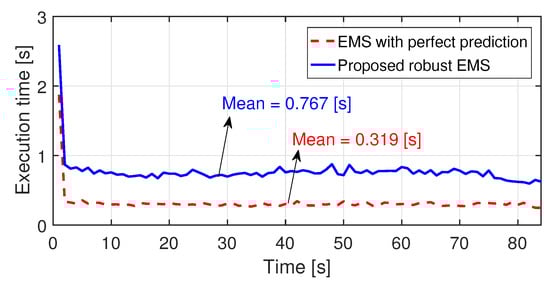 Furthermore, the computational time required to carry out all the processes involved in the proposed EMS could be an issue. The EMS with perfect predictions only requires the predictions of the uncertain variables. However, for the proposed approach, the time involved in the scenario’s generation and in the solution of the minimization problem of Equation (2) would be significantly larger. However, as Figure 5 shows, the proposed procedure to determine the number of scenarios to be generated, their generation, the computation of the corresponding probability of occurrence, and the solution of the minimization problem of Equation (2) did not significantly increase the computational time. Actually, the mean execution time of the proposed EMS is about 2.4 times the mean execution time of the EMS with perfect predictions. From our point of view, this is a striking difference between the two approaches assessed in this paper, since as previously discussed, the proposed EMS provides several additional benefits in the operation of the grid, by keeping the execution time within reasonable margins (the average execution time was about s, and the largest execution time was 2.5 s). These results were obtained by means of the tic-toc function of Matlab. Moreover, since the computational time is less than 3 s, and the sampling time used to test the performance of the power system with the proposed robust EMS was 15 min (which is a typical sampling time in this kind of EMS), the sampling time could be dramatically reduced to improve the dynamic response of the system [30]. The minimum sample time to implement the proposed EMS will depend of the capabilities of the co-generation unit to follow the changes in the scheduled power.
