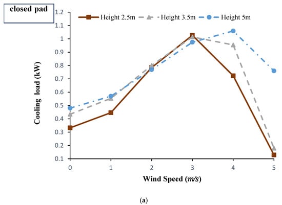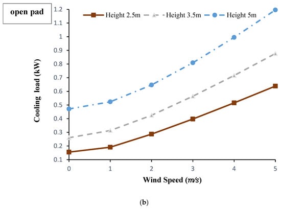 - Cooling load continuously increased with the wind speed when the pad was open. Whereas when the pad was closed, the maximum value of cooling load was achieved at a wind speed of 3 m/s.