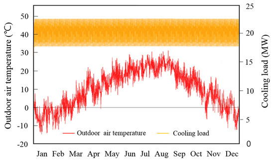 To calculate the cooling-energy consumption of the existing central chilled-water system in the data center, the cooling load of the server rooms must first be calculated. Table 2 shows the boundary conditions of the energy simulation. For the heat generated by IT servers, 6480 server racks were assumed to be installed, including 4 kW-class server-rack 720 units per floor. The converted value of server heat was 2880 kW per floor. The cooling load generated by resident personnel and lighting was considered. For load-pattern changes according to server operations, values ranging from 0.7 to 1.0 were applied for each hour. TRNSYS (17.2, Thermal Energy System Specialists, Madison, WI, USA) was used to quantitatively analyze the annual cooling-energy consumption of the data center (8760 h). The meteorological data for Seoul provided by TRNSYS were used as the OA conditions [15].