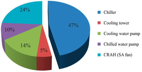 Figure 1 shows the cooling-load-calculation results. The cooling load generated in the server rooms of the data center ranged from 18,000 to 24,000 kW, depending on the operation rate of the server, independent of the OA. This was because approximately 98% of the cooling load was generated by the server racks, meaning that enormous cooling energy was consumed even when the ambient temperature was low in winter. The percentage of power consumed by each component out of the total annual power consumption of the central chilled-water system is shown in Figure 2. The chillers accounted for 47% of the total power consumption. Therefore, it is expected that the power consumption of the chillers will decrease just by improving the cooling efficiency of the server rooms because of increasing the set-chilled water and SA temperature.