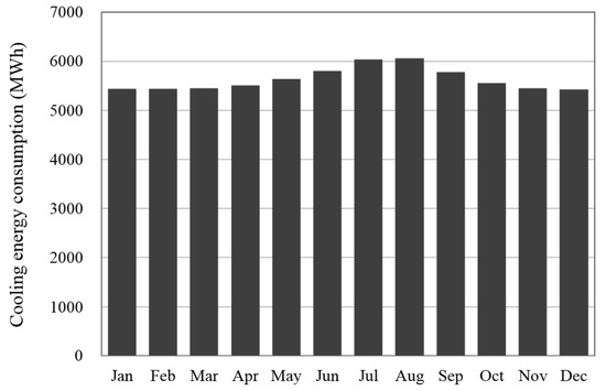 Figure 3 shows the monthly cooling-energy consumption of the central chilled-water system. The monthly power consumption of the components excluding the cooling tower and chillers was constant. This is because only the temperature of the chilled water returning to the chillers through the bypass control changes. The flow rate of the pump or the air volume of CRAH are held constant, regardless of the server-room heat and OA conditions. In addition, the energy consumed by the chillers increased with the ambient temperature. This was because COP decreased because the temperature of the cooling water flowing into the chillers increased as the outdoor-air wet-bulb temperature rose. This means that the energy consumed to produce the same amount of 5°C chilled water increased. The energy consumed by the cooling tower also increased slightly in the summer when the outdoor-air wet-bulb temperature was relatively high.