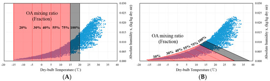 Annual outdoor air condition and outdoor air (OA) mixing ratio. (A) Temperature control; (B) Enthalpy control.