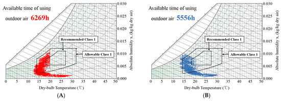 In this study, the OA availability time was calculated by assuming that OA was introduced at 25% mixing-ratio intervals, according to the temperature or enthalpy section under the climatic conditions of Seoul (Figure 5). As a result, the OA-availability times of the temperature and enthalpy control were 6269 and 5556 h, respectively. In addition, 100% OA was set to be supplied to the server rooms under the condition that direct introduction of OA was possible.