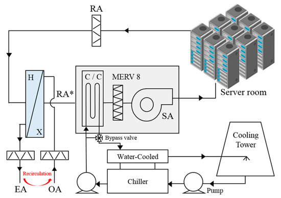 Figure 4 shows a schematic of a cooling system using a direct air-side economizer. When the outdoor temperature is low, OA is directly supplied or mixed with the return air (RA) and supplied to the server rooms to produce a cooling effect. When the outdoor temperature is high, the existing central chilled-water system is operated.
