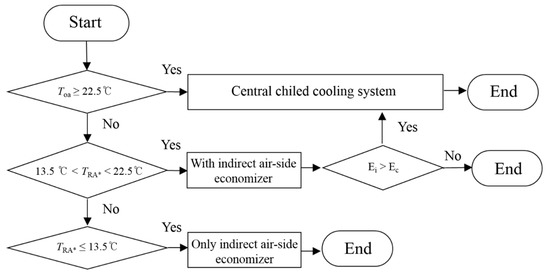 The system schematic and operation algorithm of the indirect air-side economizer is shown in Figure 7 and Figure 8, respectively. RA was first subjected to sensible heat exchange by adding an indirect heat exchanger to the existing central chilled-water system and was then supplied to the server rooms through cooling coils. The operation plan of the indirect air-side economizer was set to control three stages: one in which RA* (the RA state when it passes through the primary indirect-heat exchanger) was at or below 13.5 °C, one in which RA* was over 13.5 °C but below 22.5 °C, and one in which OA was 22.5 °C or higher. When OA is 22.5 °C or higher, it is difficult to expect the cooling effect of the indirect air-side economizer; hence, the central chilled-water system, i.e., the existing cooling system, is operated. When RA* is greater than 13.5 °C but less than 22.5 °C, a parallel-operation mode is activated in which the indirect air-side economizer is responsible for the partial load and the central chilled-water system is used for the remaining cooling load. When RA* is less than 13.5 °C, the cooling load of the server rooms is handled only by the indirect air-side economizer. The heat exchanger component model described by Equations (22) and (23) is used [21].