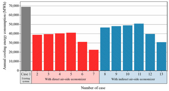 This result is similar to the annual cooling-energy saving ratio found by Ham et al. [21]. This previous study analyzed the cooling-energy consumption for various indirect air-side economizers.