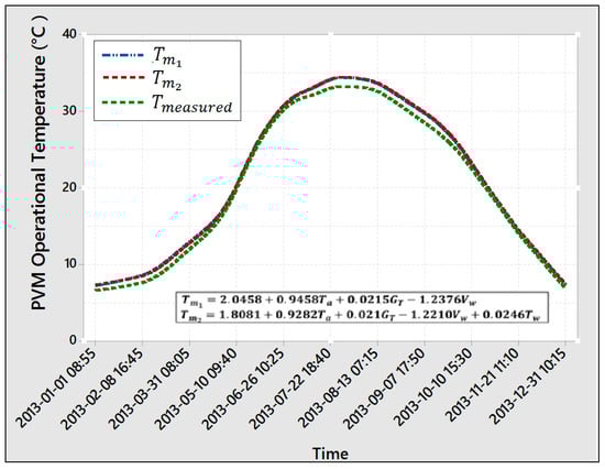 Figure 3 is a time series plot of predicted and measured module temperatures in 2013. From the graph, predicted PVM temperatures are almost always higher than measured except during third quarter where , . Coincidentally, wind speeds () are also low during same period, implying the dominance of in the two models Equations (8) and (9).