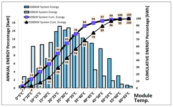 Cumulative PV energy produced throughout the year, is plotted against corresponding module temperature. As indicated, 89% of annual energy produced by the FPV system, and 68% of the rooftop system’s energy is produced when module temperatures of both systems are below 40 °C. Energy produced beyond the 25 °C is subject to power loss due to loss of open circuit () and fill factor (F.F.).