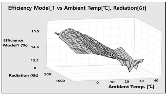 Figure 7 is a 3D plot of FPV module efficiency//. In the plot, a decrease in ambient temperature () has a positive effect of increasing efficiency between 1–2% points. The plot shows the importance in defining PVM operation temperature and, ultimately, conversion efficiency. Radiation () plays a secondary role given the minimal impact on efficiency. It can be observed that, at higher radiation levels, varies more frequently, and this impacts power stability.
