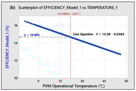 (a) Time series plot of module efficiency (Model 1); (b) efficiency over module temperature.
