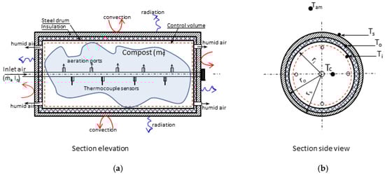 where mc is the mass of compost (kg), and Cpc is the specific heat of compost at constant pressure (J·kg−1·°C−1). The convective-radiative heat loss (Qloss in W) from the outer surface of the bioreactor to the surrounding air (Equation (2)) is given by
