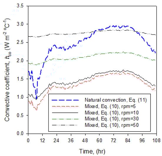 Convective heat transfer coefficient at the outer surface of the reactor cylinder, hco (W·m−2·°C−1) estimated for the mixed convection (Equation (10)) and natural convection (Equation (11)) mechanisms.