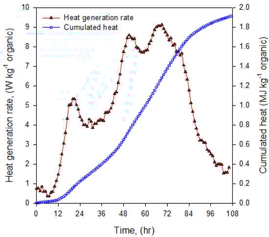 The rate of heat generated during the composting process (W·kg−1 of compost) and the accumulated heat (kJ·kg−1) are illustrated in Figure 6 during the 107 h of composting time. As the heat was generated, the compost temperature (Tc) increased reaching 66.8 °C at the peak time. The peak of heat generation rate was 9.3 W·kg−1 of organic matter reached after 72 h of the composting process. In total, an amount of heat totaling 1.9 MJ per kg organic matter was generated during composting. Evolution of heat generation in Figure 6 depends on several parameters controlling the reaction process such as: aeration effectiveness, the humidity distribution in the compost, oxygen and nitrogen concentration, and so on. In Figure 6, reduction in the heat generation rate was observed after 18 and after 48 h of operation and the drastic reduction was observed after the temperature of compost (Tc) reached 66.8 °C (cooling phase). This limit of temperature may have exceeded the optimum temperature for thermophilic microorganisms; therefore, microbial growth and activity declined. As a result, the heat production rate as well as the compost temperature drastically decreased. Another reason would be that the consumption of bioavailable nutrients by the microorganisms reduced the metabolic reaction [].