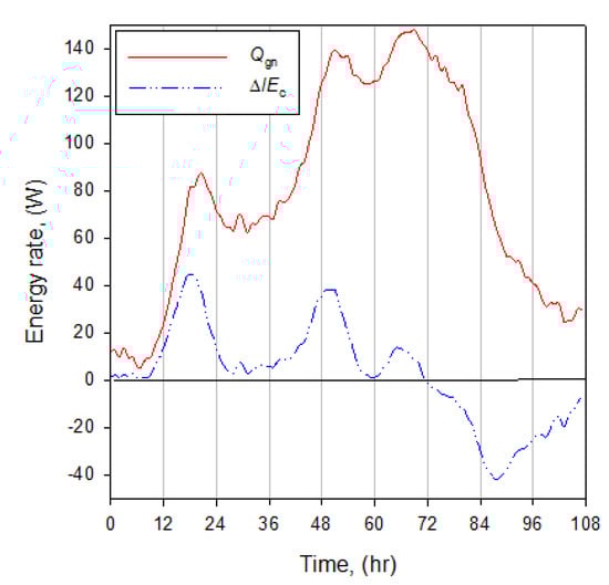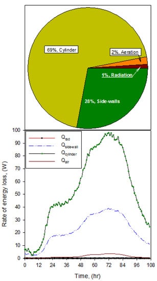 According to Clark et al. [] and Miller [], the heat losses in laboratory-scale bioreactors are expected to be high due to the higher surface area to volume ratio. The convective-radiative heat loss from the outer surface of bioreactors was accounted to be in the range of 60–90% of the total heat losses [,,]. For the present analysis, the time course of different modes of energy rate loss from inside to outside the reactor is illustrated in Figure 7. This figure showed about 96% of the generated heat was lost to outside the bioreactor via convection, radiation, and aeration processes. Due to the high surface to volume ratio, most of the heat loss (97% of the total loss) was lost by convection from the outer surface of the bioreactor (69% via cylindrical body and 28% via vertical side walls). However, only 2% of the total heat loss was lost with the exhausted gas during the aeration process. The minor thermal radiation loss (1% of the total loss) is because the bioreactor’s surroundings were the laboratory walls with an assumed equivalent temperature equal to the ambient air temperature (Tam). However, for bioreactors operating outdoors, the outer surface of the bioreactor would exchange thermal radiation with the sky dome (with an equivalent temperature, Tsky, which is much lower than the ambient temperature, Tam). In this case, the contribution of thermal radiation loss would be much higher than the radiation loss from the indoor operated bioreactors. During composting process, the rate of change of the internal energy of compost (ΔIEc = mcCpc(dTc/dt)) was linked to the heat generation rate (Qgn) and is illustrated in Figure 8. The rate of change of the internal energy strongly depends on the variation of heat generation as well as the compost temperature. During the temperature raise period (the active phase), the internal energy of compost increased (energy gain, positive, +ve), while in the cooling phase period, the internal energy decreased (negative, –ve). Therefore, the heat gained by the compost accounted for only 4% in the form of internal energy.