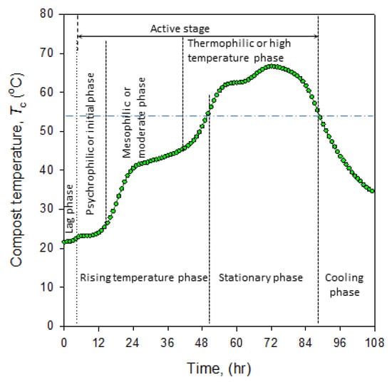 Under optimal conditions, beyond the lag period, composting proceeds from the initial state (≅10 h) through three phases as illustrated in Figure 9. These phases are (i) the moderate-temperature phase, (Tc = 25–45 °C), which lasted for about one day, (ii) the high-temperature (thermophilic) phase, which lasted for two days, and (iii) the cooling and maturation phase, which lasts from one day in the bioreactor (the cooling phase in the present experiment) to several days outside the bioreactor for maturation process. Results in Figure 9 show that time consumed in the high-temperature phase could be significantly reduced to about two days compared to several days or even several months in other composting methods. However, during the thermophilic phase the temperature remained above 55 °C for a period of 36 h that may enough to satisfy the regularity requirement for the destruction of pathogens. This is because compost temperatures from 52–60 °C are able to maintain the greatest thermophilic activity in composting systems and reduce weed seed viability and suppression of pathogens activity [,].