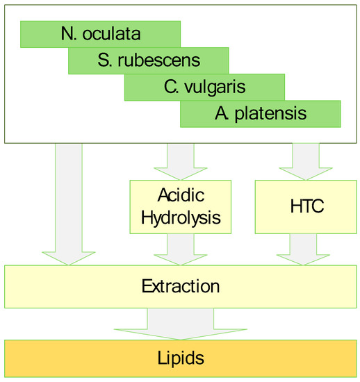 Besides the higher HTC char yield of S. rubescens and C. vulgaris (Table 1), and the proportionate variation of the lipid yield according to the treatment procedures (direct, acidic hydrolysis, HTC treatment did change (Figure 5).