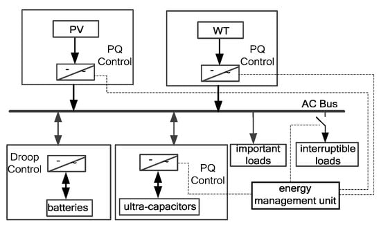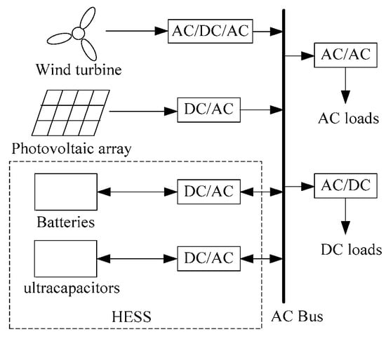 Common types of energy storage include: battery, ultracapacitor, superconducting energy storage and flywheel energy storage, etc. Many researchers have investigated optimal capacity configurations of energy storage devices. In most studies on the optimal capacity configuration of hybrid energy storage systems, a microgrid is considered a grid-connected operation. Their objective was to calculate the capacity and smooth fluctuations in the tie-line power flow [,]. However, the isolated microgrid has higher requirements for the control of an energy storage system. It is difficult to deal with the change of operating conditions and the longer use of single storage []. Related research [,] shows that the combination of high-power density energy storage devices, such as ultracapacitors and batteries, can make full use of their complementary characteristics, and improve the power output of energy storage. Due to the high energy density of the battery and the high power density of the ultracapacitors, this paper selects the ultracapacitor and the battery as hybrid energy storage systems (HESSs) for an isolated microgrid.