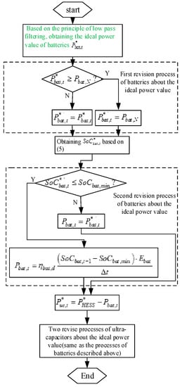 The optimal power of the battery () is obtained by low-pass filtering principle. Then, is corrected considering the rated power. By determining whether the SoC reaches its limit after compensation, the value is corrected again. These revision processes are described in Figure 2, which considers the battery discharge process.